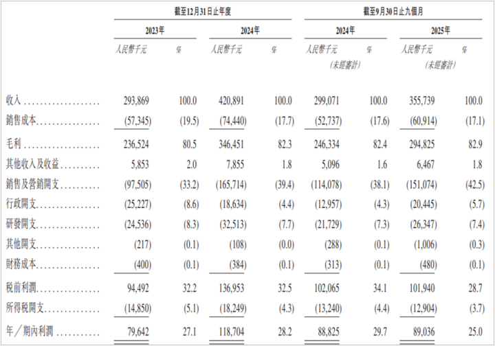 公司利润增长停滞的核心原因或许是销售费用的吞噬。招股书显示,公司销售及营销费用率持续攀升,从2023年的33.2%升至2025年前三季度的42.5%,三年累计上升9.3个百分点。