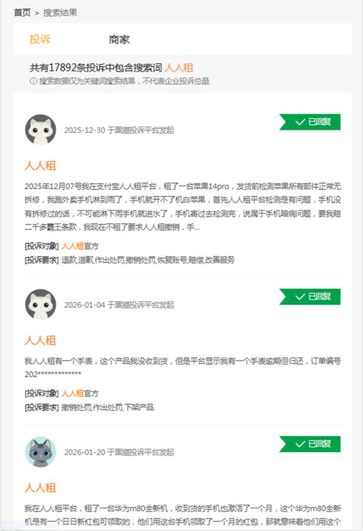 更严重的是,用户投诉量居高不下。黑猫投诉平台数据显示,截至2026年1月,人人租相关投诉量超1.7万条,核心投诉集中在无端扣款、买断价虚高、货不对板、监管锁不解除等问题,部分投诉还涉及“租赁陷阱”等恶性事件,且曾被央视曝光。