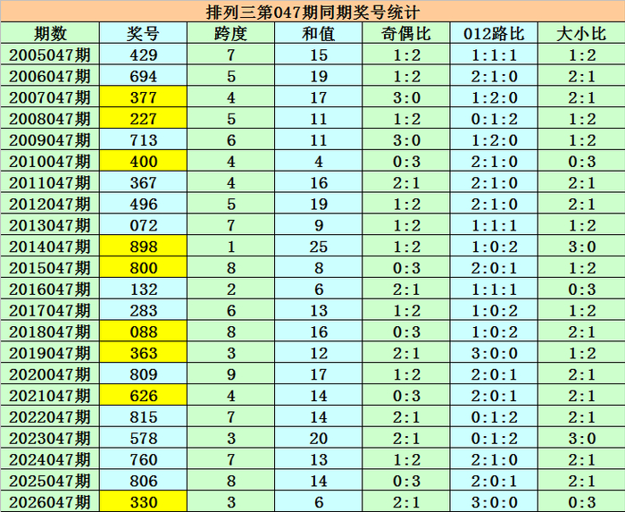 上期转头:摆设三第2026047期奖号为330,组选类型为组三,奖号大小比为0:3,012路比为3:0:0,奇偶比为2:1。