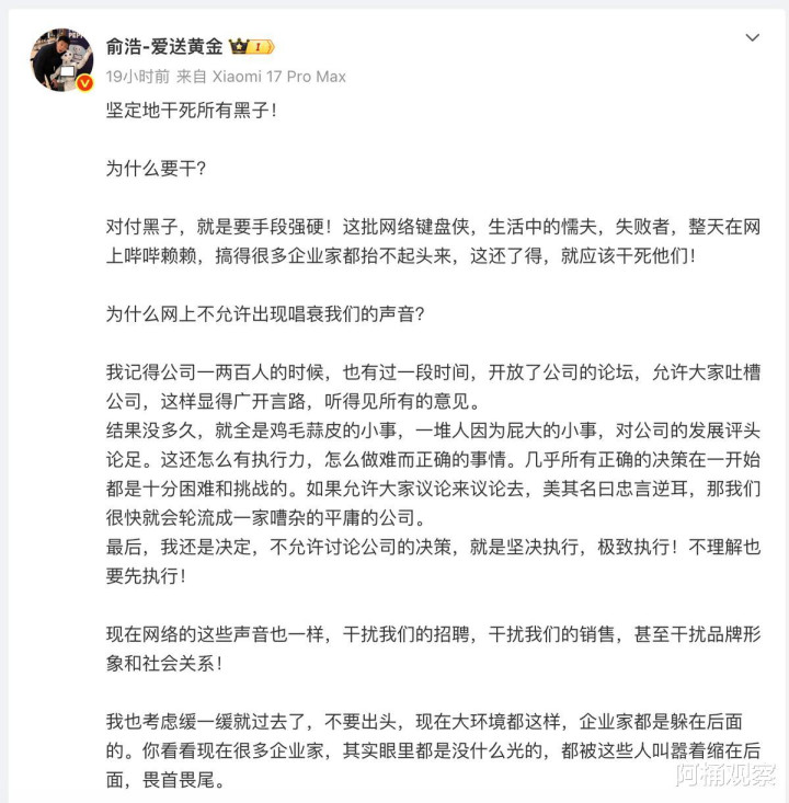 撰文|曾宪勇 最近,科技圈出了个挺让人感慨的事情。 现在如果你在微博上搜索“俞浩”,你会搜到一个头像还是那个理工男,但ID却换成了“俞浩-爱送黄金”的账号。让我想不到的是,他就是追觅科技的创始人俞浩——一个甚至曾经刻意回避媒体镜头,低调对外,只想把产品死磕到极致的CEO 。 当一个曾经信奉“产品说话”的技术极客,被迫把自己的名字改成带着豪横感的“散财童子”,甚至在微博上喊出“重拳出击”的时候 ,你就知道,业内知名的一位老实人这次是真的“被逼急了”。 在笔者看来,其实这不仅仅是俞浩一个人的情绪爆...