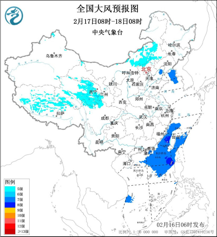 预测,2月16日08时至17日08时,内蒙古中东部、新疆北部和东部、青海中南部和东部、西藏西北部、甘肃西部、江淮南部、江南北部等地部分地区有5~6级、阵风7~8级的大风;黄海中部和南部海域、东海大部海域、台湾海峡、台湾以东瀛面、南海东北部海域将有7~8级、阵风9级的大风。