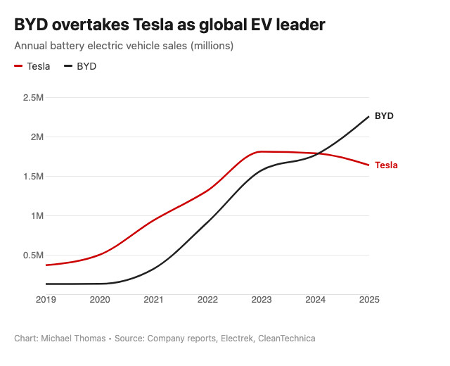 但二十多年后的今天,你再问好意思国东谈主中国有什么品牌,他们能说出华为、大疆等等,而且最新的大事发生在2025年——谁齐没猜测,在电动汽车领域,也曾的“王者”特斯拉,一直稳居第一,尽然被咱们中国的比亚迪超越了。以前特斯拉刚进中国时,谁开特斯拉齐认为罕见牛、显得很繁荣,甚而有东谈主说那是在“装”。但2025年,比亚迪拿下了全球电动汽车销售冠军,这放在当年简直不敢设想。
