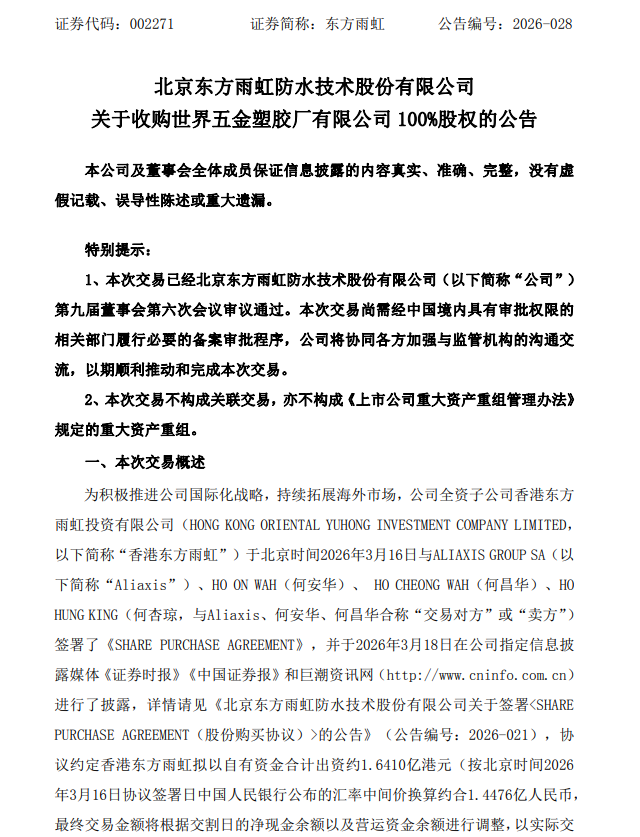 4月9日,东方雨虹(002271.SZ)公告称,公司全资子公司香港东方雨虹拟以自有资金共计出资约1.6410亿港元(约合1.4476亿元东谈主民币)收购寰球五金塑胶厂有限公司100%股权。