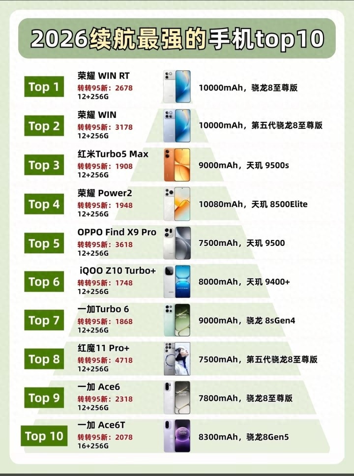 以上即是2026年长续航手机TOP10名次榜的一说念内容,从荣耀WINRT的10000毫安时到一加Ace6T的8300毫安时,这些手机展示了2026年电板时期的最新效果,蚀本者不错把柄我方的预算和使用需求选择合适的机型,无论是追求极致续航的荣耀WIN系列,如故认真详细体验的OPPO和iQOO,亦或是主打性价比的红米和一加pk10官网,这份榜单皆提供了显然的参考,长续航依然成为2026年智高手机竞争的紧要维度,将来跟着电板时期的进一步发展,手机的续航发扬还会愈加出色。