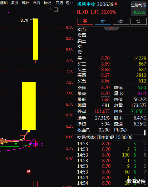 从本事面上来看,凯普生物(300639)该股在板块的带动下,2天2板!2个往改日股价飞腾了44.04%!均线呈现多头成列,MACD有不绝上扬的能源,主力资金呈现流出状况。该股入选龙虎榜,净买入额为-5804万元。