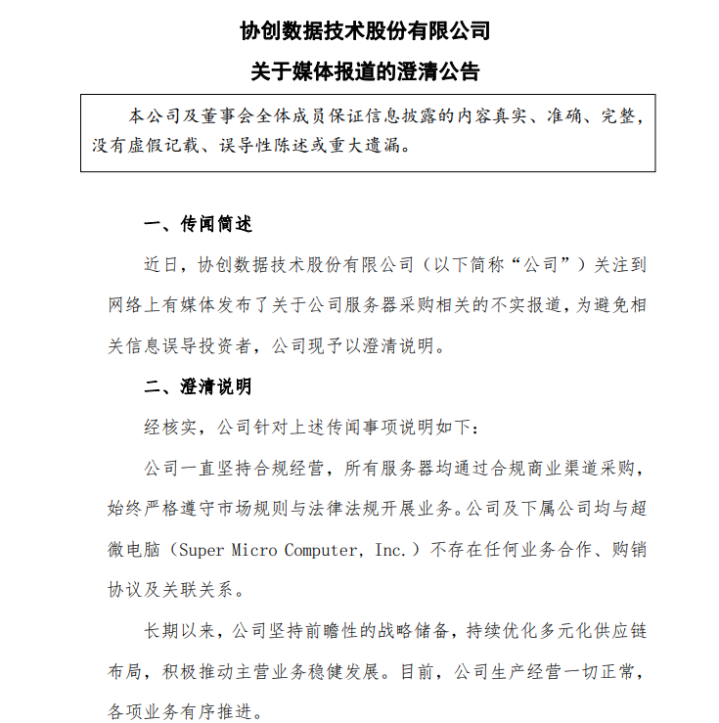北京pk10官网 协创数据: 澄澈与超微电脑无业务合营及关联关系