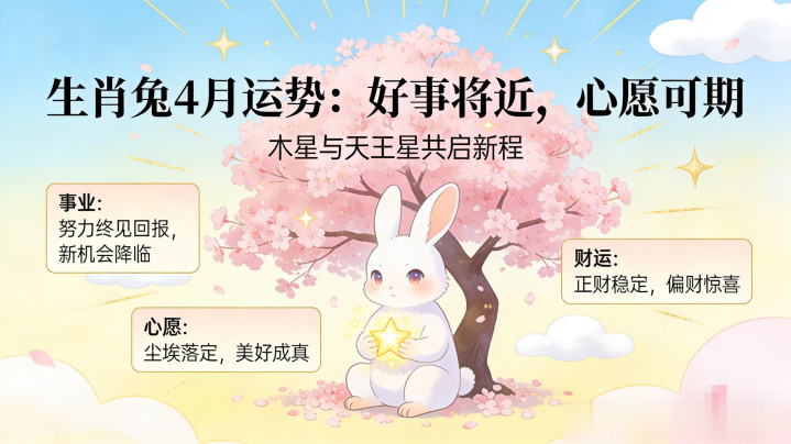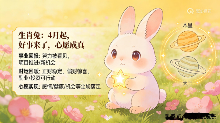 文/中琰引航航长 亲爱的生肖兔,最近是不是总认为心里有一团火,却又说不清说念不解? 明明一经很力争了,可总认为差了那么连气儿。思作念的事,总被实践绊住脚;心里阿谁念了很久的心愿,反复揣测,永久不敢领域一搏。 别急。 从4月份运行,你的东说念主生要迎来的确的窜改了。 这不是安危,而是运势实实在在的变化。夙昔几个月,你可能资格了不少周折——使命上的压力、东说念主际联系的耗尽、致使是对我方才能的怀疑。但这一切,皆会在4月之后迟缓翻篇。 为什么是4月? 因为从4月起,木星和天王星将为你怒放一扇新的门。...