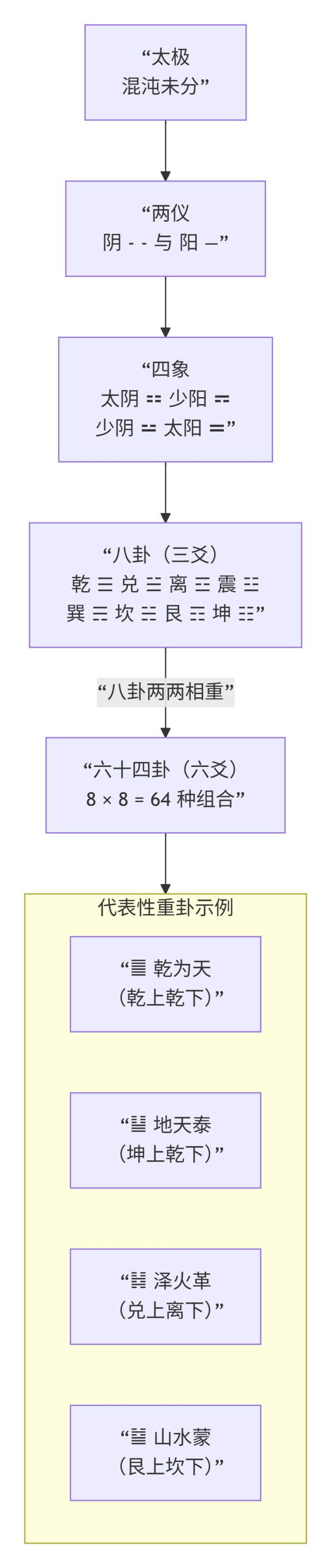 上图清晰地展示了从太极到六十四卦的完整生成逻辑。正如家族由单个成员结成复杂亲缘关系,世界由基本元素通过无限组合构成复杂情境。