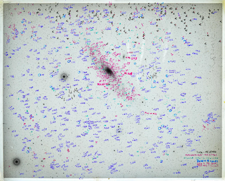 这张摄于 1934 年的仙女座星系照片,是在哈佛大学橡树岭天文台拍摄的,上面有很多标记,因为它被用来统计星系的数量。图版 MC27415。1934 年 9 月 11 日。哈佛底片库。哈佛大学和史密森学会天体物理中心,马萨诸塞州剑桥市。
