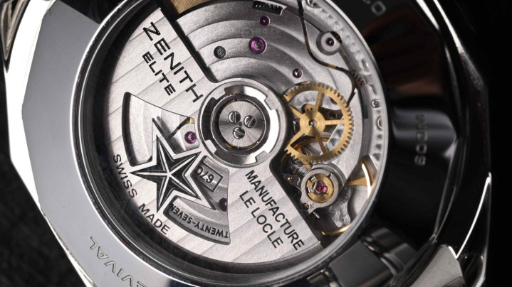 翻转手表能看到透背筹画的蓝支持底盖,雷同能不雅察到里面表厂平正的Elite 670型自动上链机芯,动储为50小时。领先映入眼帘的当然是真力时标记性的五角星镂空摆陀,除此之外还能看到夹板上过程大面积的日内瓦波纹守密,基层夹板铺满了珍珠纹。