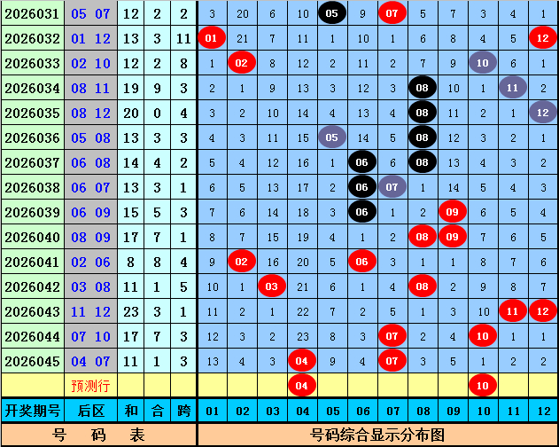 后鉴别析:上期后区开出两码04和07,分别遗漏了23期和0期,最近10期后区奖号大小个数比为12:8,奇偶个数比为8:12,本期后区刺眼号码04、07、09、10、11,精选两码04、10。