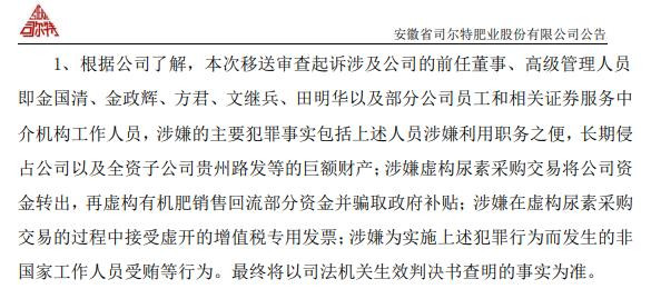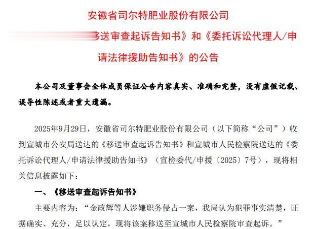 2025年9月,司尔特公告称,金政辉、方君、黄席利、田明华、金国清等东说念主涉嫌职务侵占罪,该案已移送至探员院审查告状。据裸露,除司尔特可能涉嫌单元积恶外,司尔特在“金政辉等东说念主涉嫌职务侵占一案”中的身份为受害东说念主。