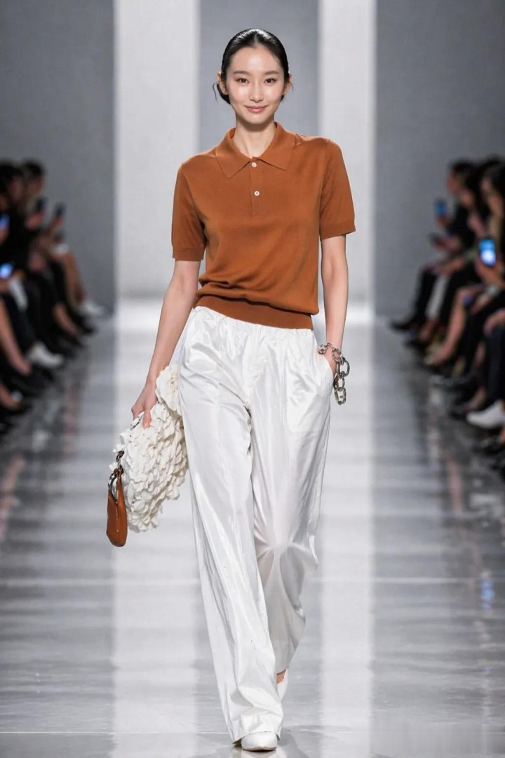 ⑨ 焦糖棕短袖Polo衫 × 奶油白高腰阔腿裤