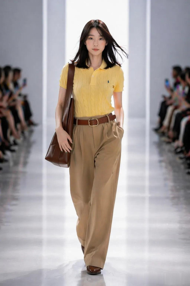 ⑩ 奶油黄短袖Polo衫 × 可可卡其高腰西装裤