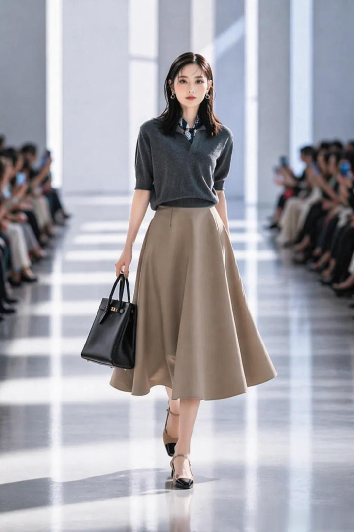 ⑧ 高等灰修身Polo衫 × 燕麦卡其直筒长裙