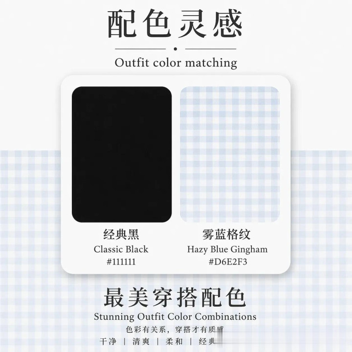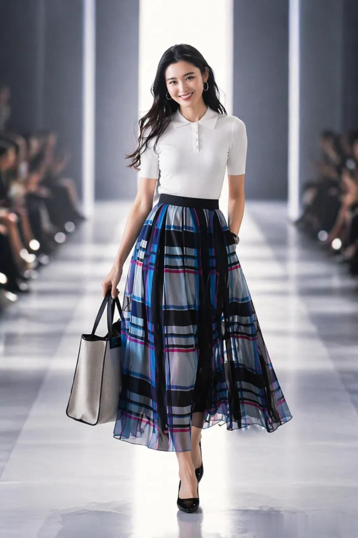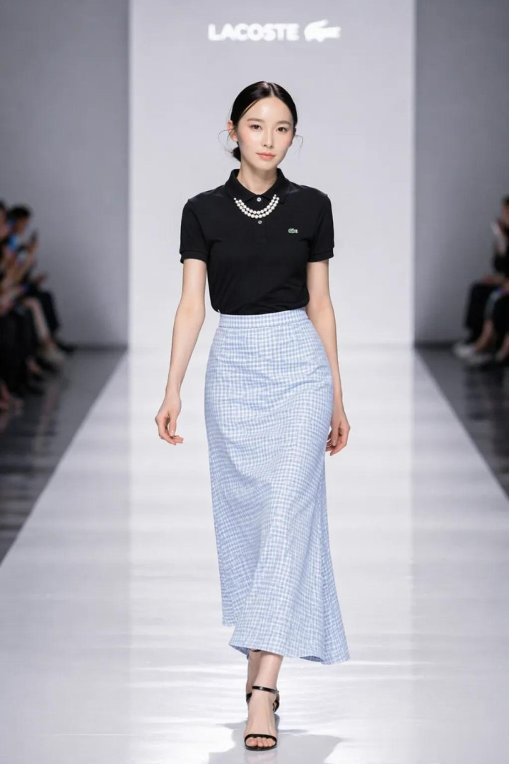 ③ 经典黑Polo衫 × 雾蓝格纹半裙