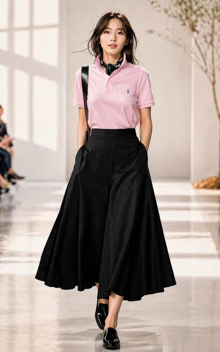 ⑥ 柔雾粉真诚Polo衫 × 开阔黑高腰A字裙