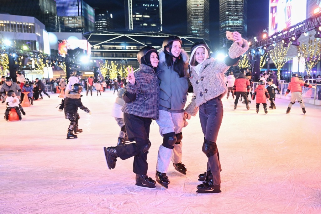 2025年12月31日晚,来自俄罗斯的达莎(右)和一又友在徐汇滨江露天冰场开启跨年游。倾盆新闻记者 朱伟辉 图