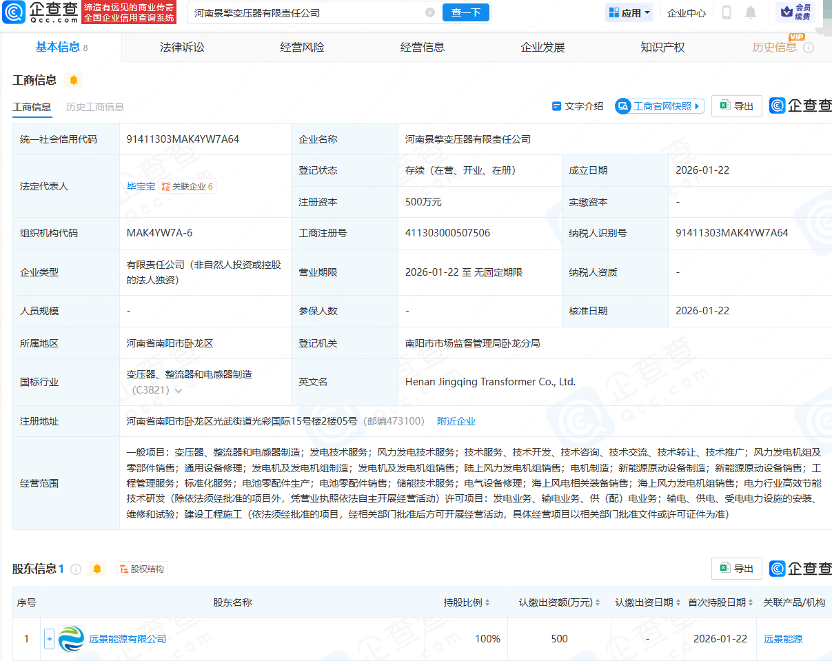 近日,河南景擎变压器有限包袱公司建筑,法定代表东说念主为毕宝宝,贪图限制包含:变压器、整流器和电感器制造;发电技巧管事;风力发电技巧管事;发电机及发电机组制造等。企查查股权穿透表示,该公司由前景动力有限公司全资抓股。 星空体育app官方网站pk10官网...
