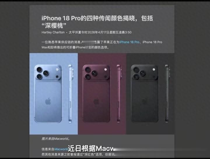 2026年4月,科技媒体Macworld发布了一则对于苹果行将推出的iPhone 18 Pro系列配色决策的独家报说念,赶紧激发了大众果粉的热议。凭证熟悉苹果供应链的讯息东说念主士泄露,苹果正在为iPhone 18 Pro与iPhone 18 Pro Max贪图一套全新的色调体系,其中最引东说念主注指标莫过于“远峰蓝”这照旧典配色的强势回来,同期还将推出一种名为“深樱桃”的年度主打新色,象征着苹果在Pro系列机身好意思学上的一次蹙迫转化。 这次曝光的配色决策共包含四种花样,永诀是浅蓝色(对应P...