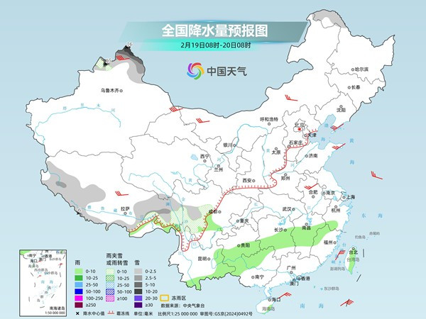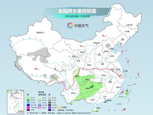 翌日,黑龙江西北部、新疆北疆北部、西藏南部和东部、川西高原南部等地部分地区有小到中雪或雨夹雪,其中,新疆北疆阿勒泰和塔城西部高海拔地区、西藏西南部等地部分地区有大雪,局地暴雪(10~16毫米);江南南部、贵州南部、四川盆地西南部、广西北部和西部、云南东部和南部、台湾岛等地部分地区有小雨。