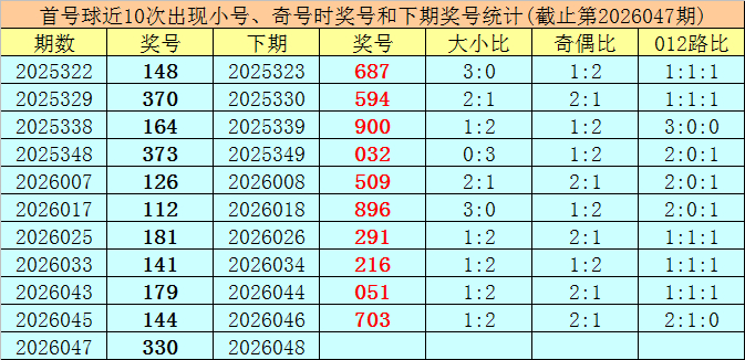 首号球:上期奖号为3,开出小 号、奇号,该位前10次开出小 号、奇号的舒心时其奖号分辩为:148、370、164、373、126、112、181、141、179、144,其中首号球012路比为2:8:0。