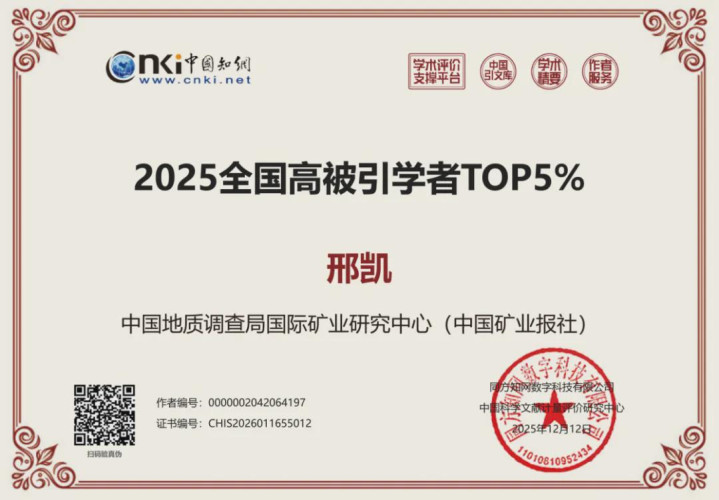 近日,中国知网下属的中国科学文件计量评价考虑中心(出书智库)基于国内学术后果收录数据,认真发布“2025世界高被引学者”名单。我单元海外矿业考虑室向杰、邢凯2位博士收效入选“世界高被引学者Top5%”榜单,开元棋牌app充分展现了本单元在资源产业考虑限制的学术影响力与科研实力。
