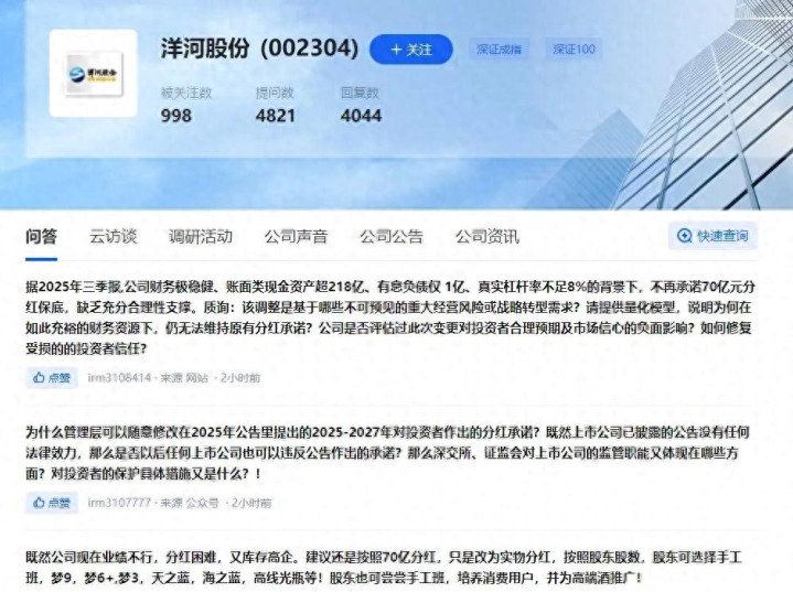 今天早上刷到朋友圈好多人在骂洋河,说昨天一公告,股价直接砸到八年最低。我本来没多想,结果点开雪球看评论,16万股东都在问:去年刚拍胸脯说“至少70亿”,今年就改口“看利润多少再定”,连个提前招呼都没打。这不是耍人吗?