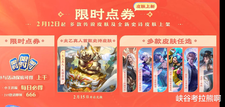 那接下来我就帮巨匠整理一份春节皮肤清单,供巨匠参考购买,4款免费皮肤上线和得到神色我会额外标出。