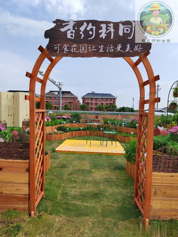 防腐木花门是可食花圃空间过渡与功能分区的点睛之笔,常用于菜园、果园、香草区的分界处,打造“一园多景、移步换景”的效果。从简对称式花门适配规整式菜园,当然弧形款契合野趣型可食花圃,可搭配攀爬型食用植物,弱化硬质分隔感。