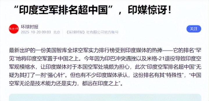 环球时报《“印度空军排名超中国”,印媒惊诧!》