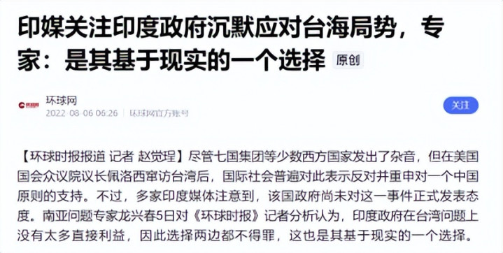 环球网《印媒关怀印度政府千里默应酬台海局势,行家:是其基于试验的一个聘用》