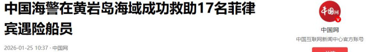 中国海警在黄岩岛海域凯旋挽回17名菲律宾遇险船员-2026-01-25 10:37·中国网