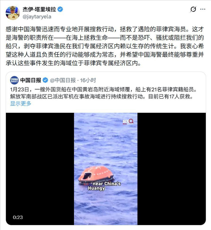 事情还得从1月22日晚上9点半提及,在黄岩岛隔邻海域,一艘挂着新加坡国旗的货轮一刹际遇了没顶之灾。这艘船上的船员,清一色全是菲律宾籍。