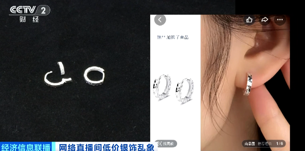 “足银饰品999”直播间宣称“除了银子莫得其他杂质”的耳饰,检测发现主体为铜锌合金,实测银含量仅为0.67%。