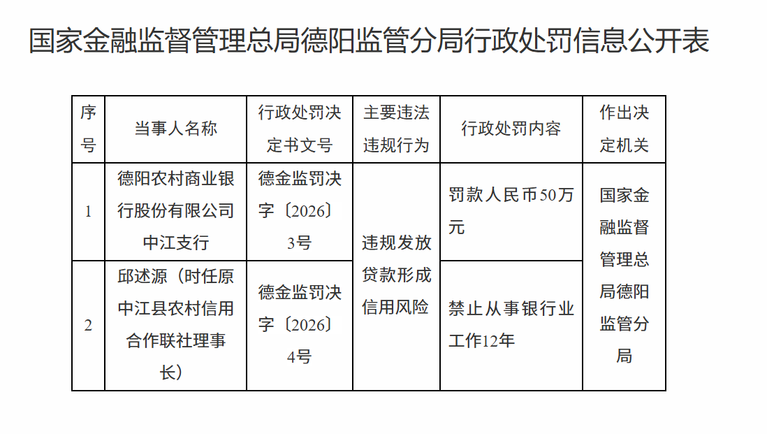 2月3日,国度金融监督处分总局德阳监管分局行政处罚信息公开表显现,北京pk10官方网站德阳农村买卖银行股份有限公司中江支行因非法披发贷款酿成信用风险被罚金东说念主民币50万元;连累东说念主邱某源被辞谢从事银行业使命12年。