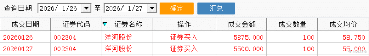 洋河股份,周一58.75元、周二55元,分别买入100股,在两个定投账户。
