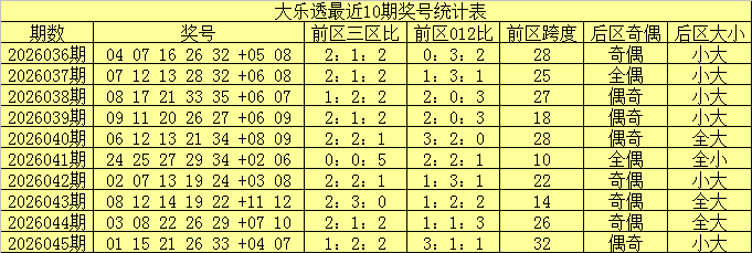 大乐透第2026045期奖号开出:01 15 21 26 33 +04 07。其中前区三区比为1:2:2,012路比为3:1:1,后区开出一大一小、一奇一偶奖号。